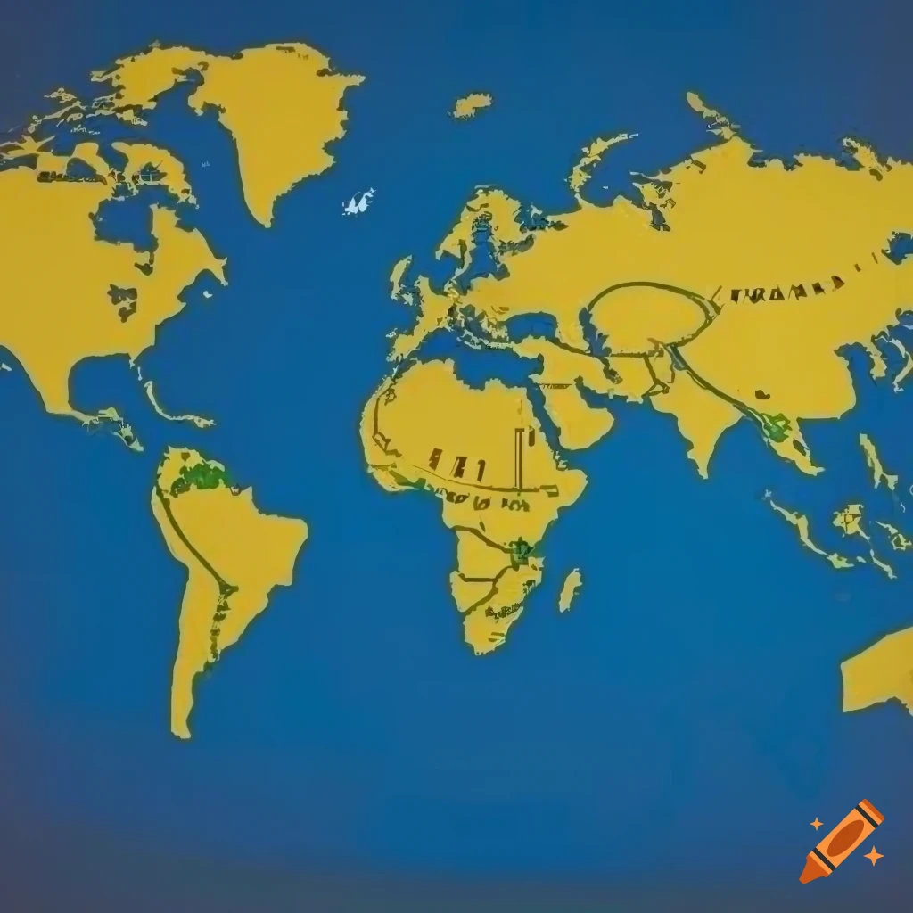 Flat world map with land part in yellow colour and oceans in dark